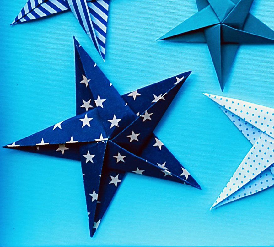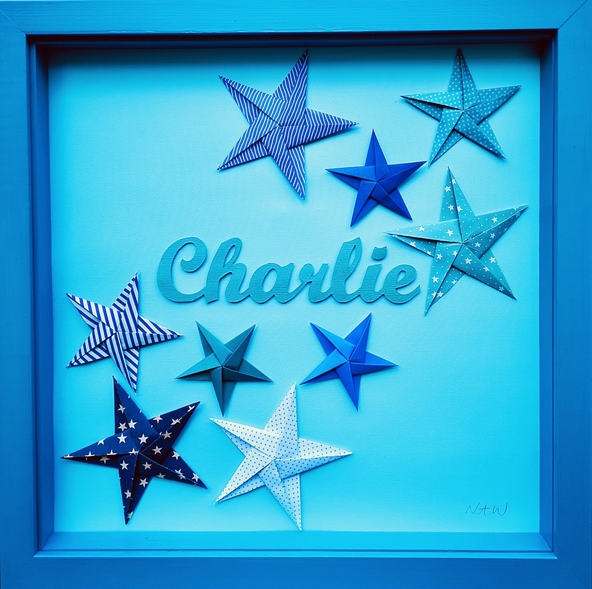 handmade paper origami stars surrounding a hand cut paper name. Stars can be made from plain or patterned paper and mixed with stars made from pages from your favourite book
