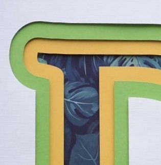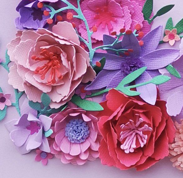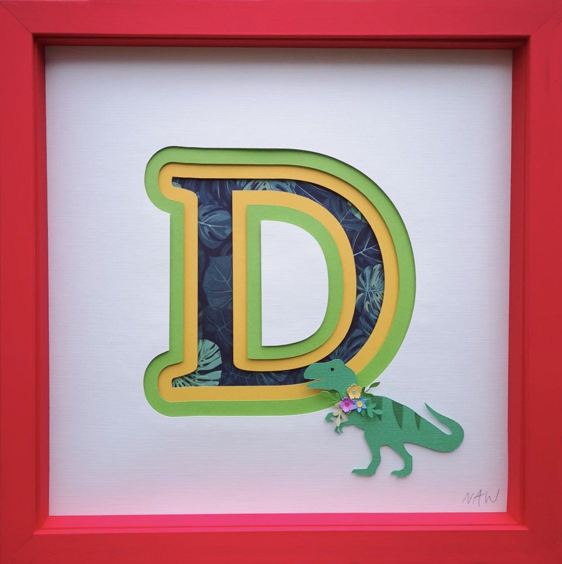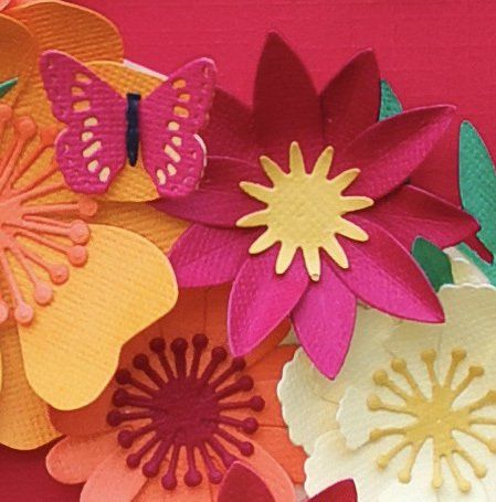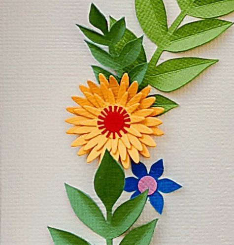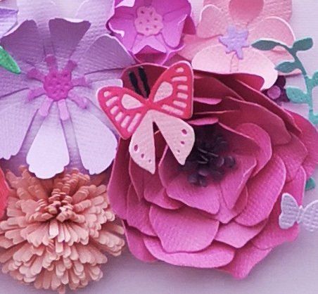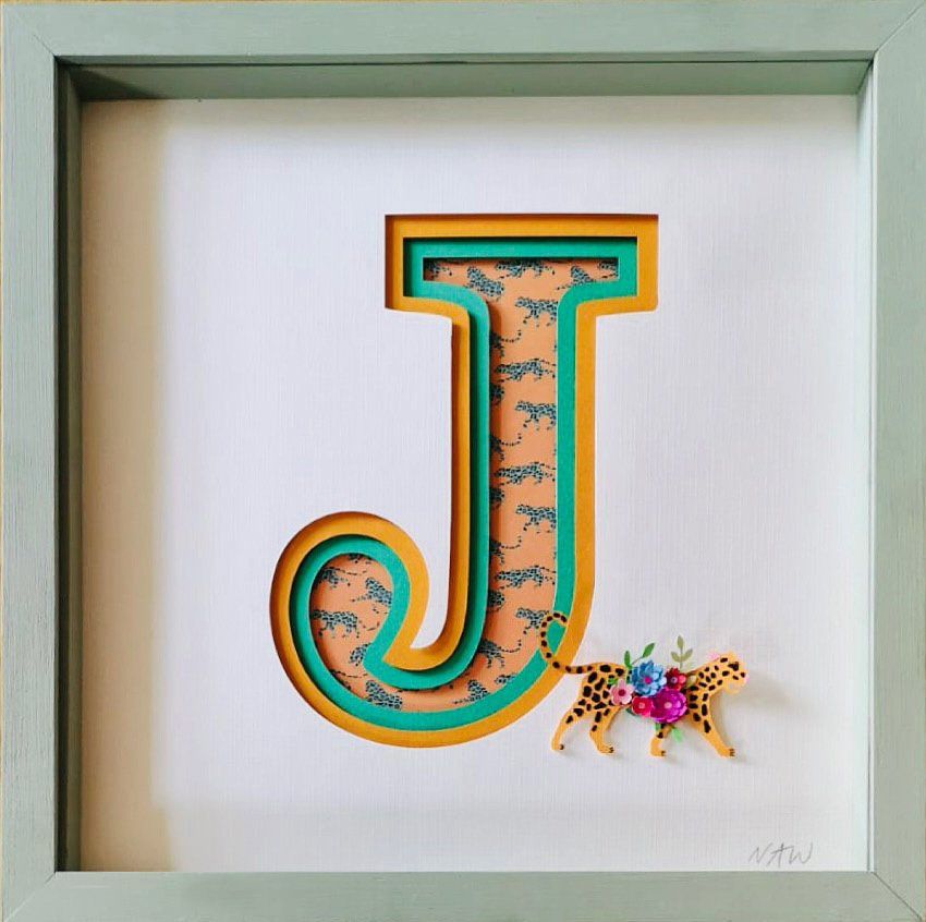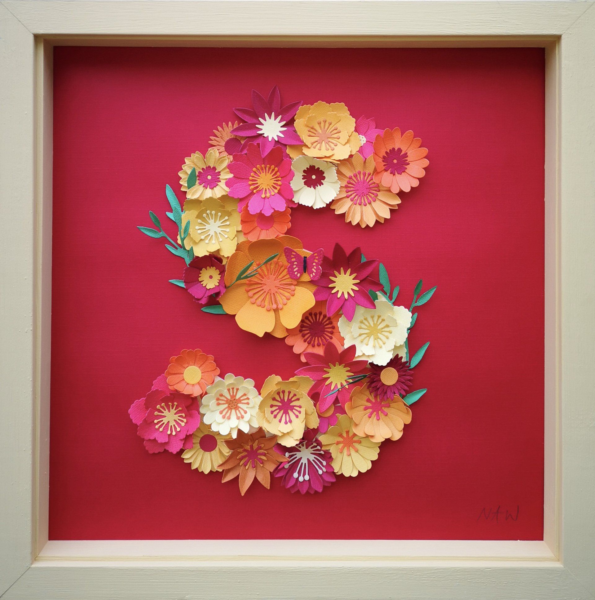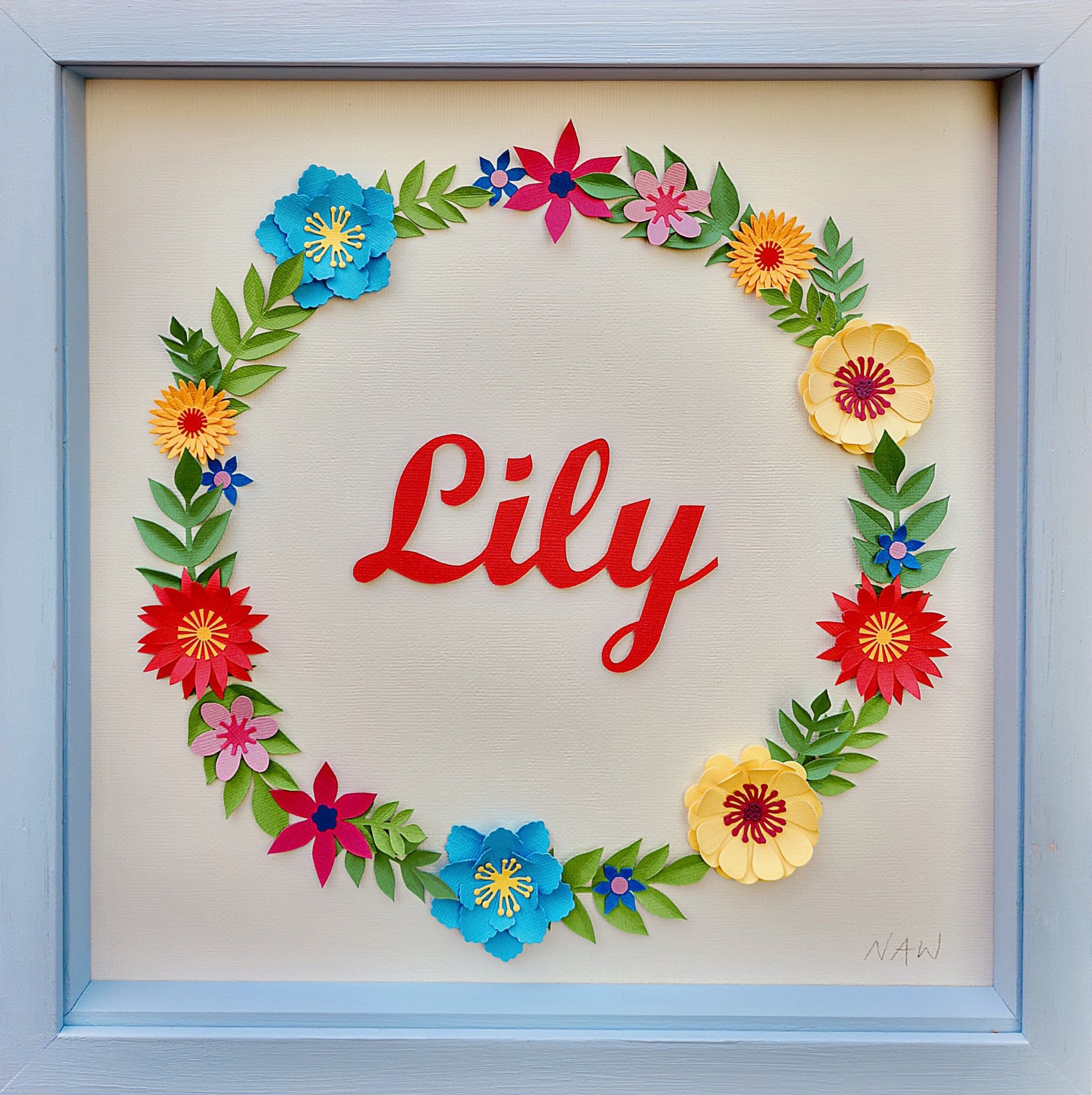 handmade paper flowers and leaves surrounding a name, hand cut from paper and raised from the background