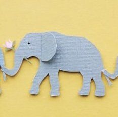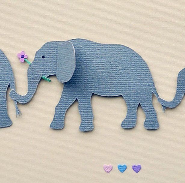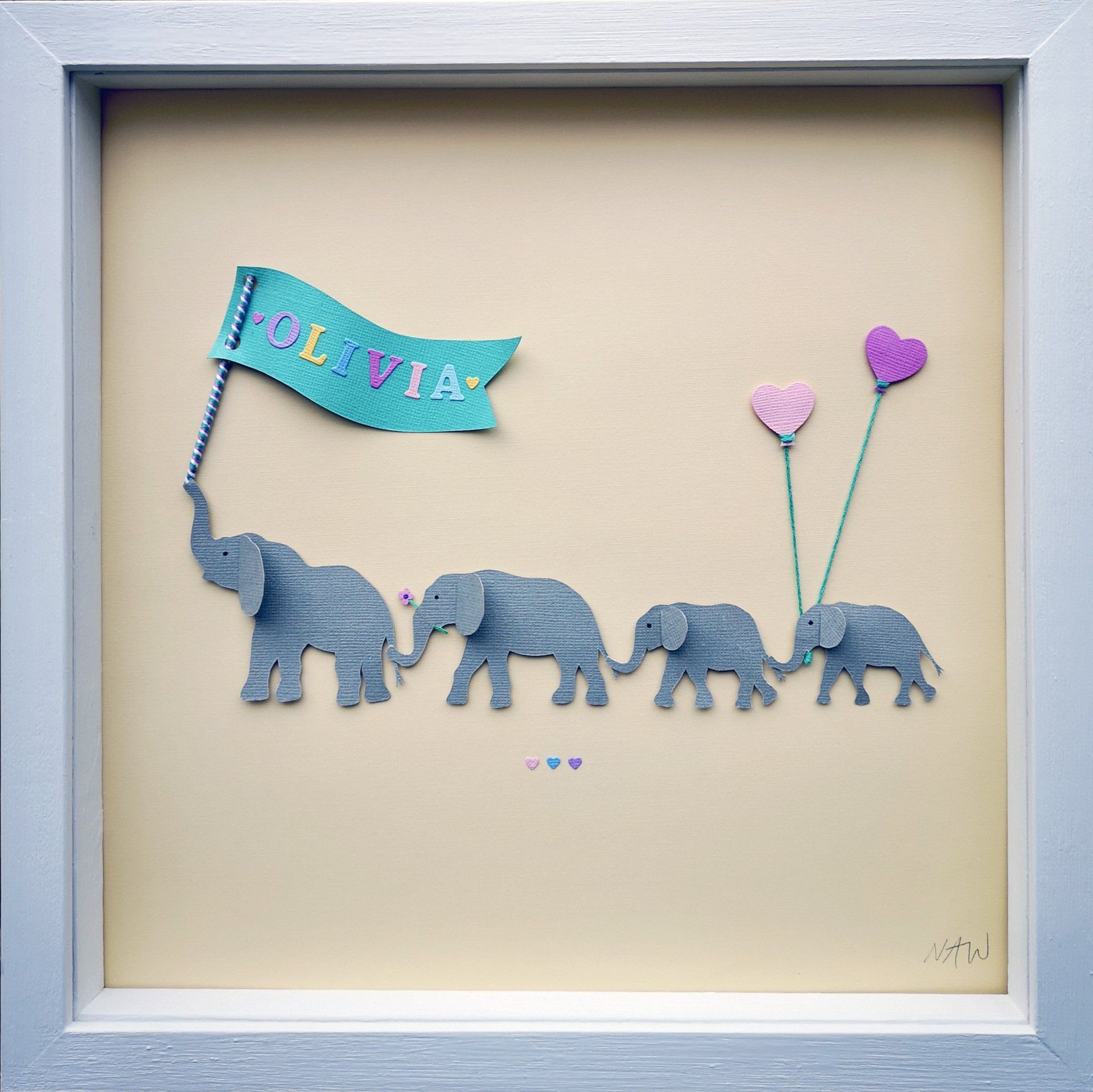 a family of hand cut elephants with a paper name banner and heart balloons