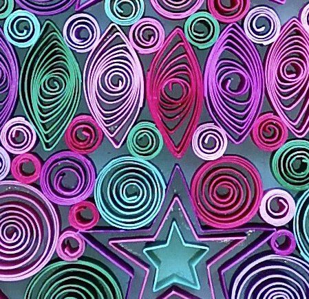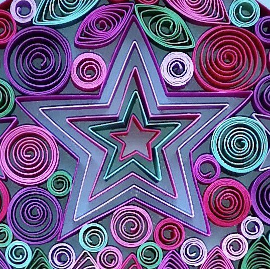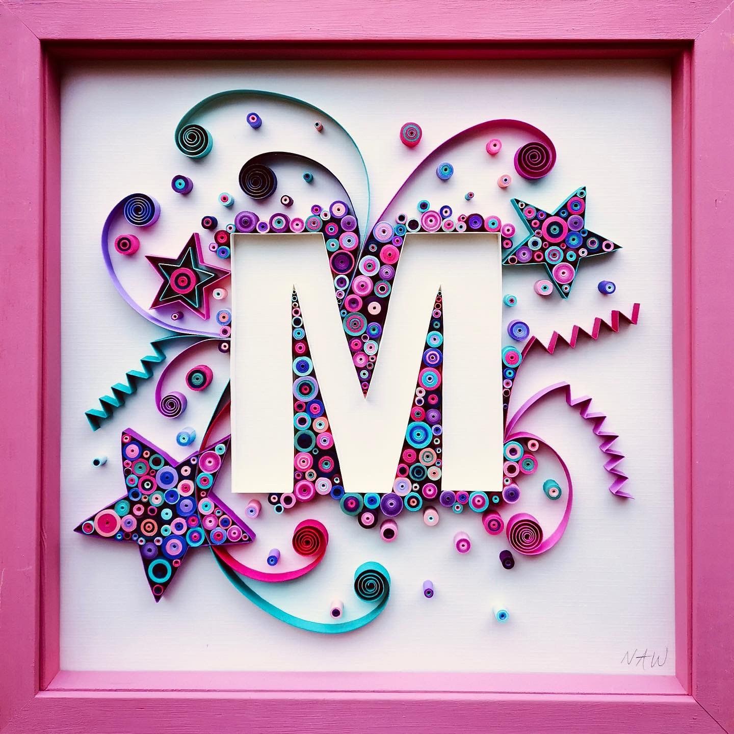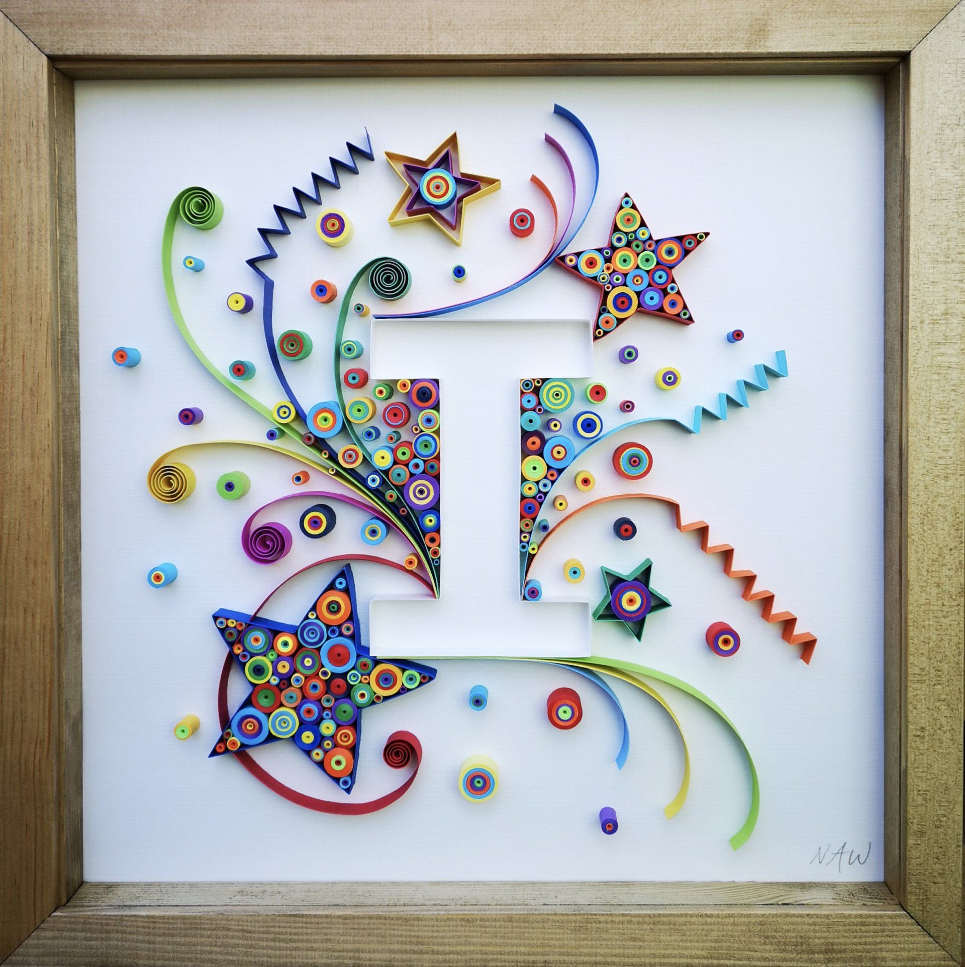 paper outlined initial surrounded by a paper quilled explosion of stars, flowers and more