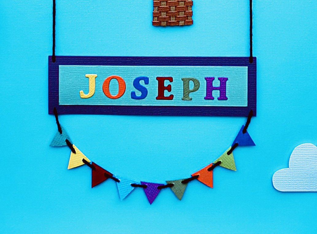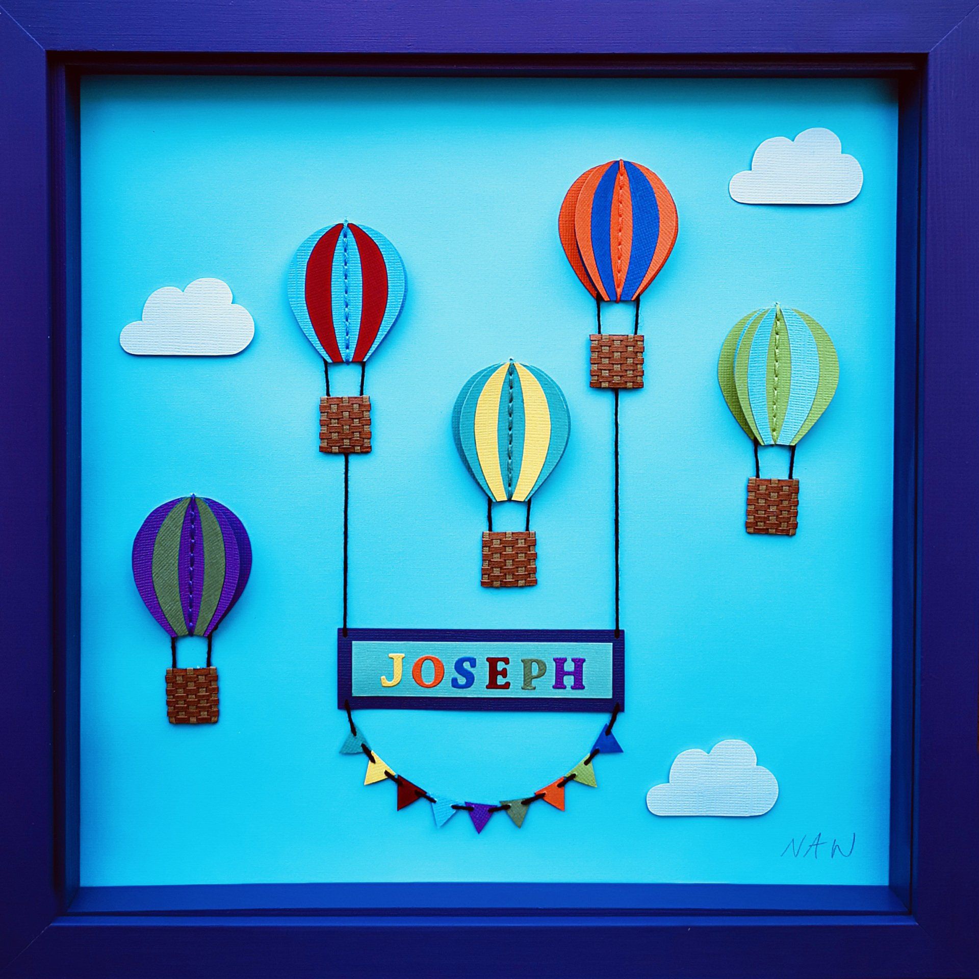 a handmade name banner carried by hand cut and stitched hot air balloons with paper woven baskets