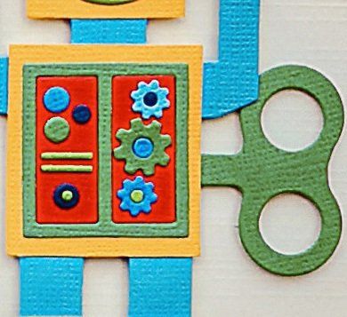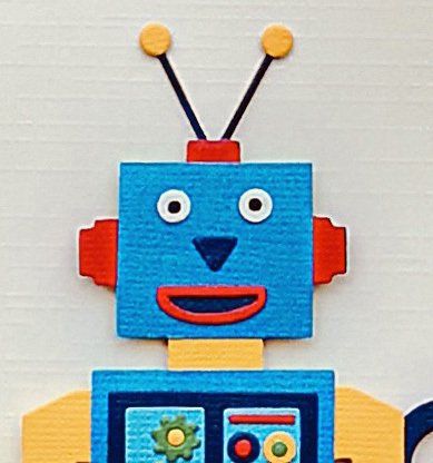 handmade die cut robots with a name banner supported by a thread wrapped pole